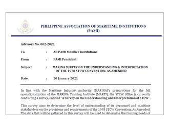 Advisory No. 002-2021 MARINA SURVEY ON THE UNDERSTANDING & INTERPRETATION OF THE 1978 STCW CONVENTION, AS AMENDED