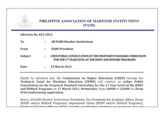 Advisory No. 011-2021 CHED Public Consultation of the Proposed Standard Curriculum for the 1st Year Level of the BSMT and BSMARE Programs